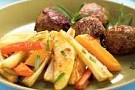 2. Skala potatisen och rotfrukterna. Klyfta potatisen och skär rotfrukterna i stavar. Lägg alltsammans på en bakpappersklädd plåt. Pensla med Becel flytande och rosta i ugnen ca 30 minuter tills de är genomstekta och fått gyllenbrun färg. Rör om då och då. Strö på salt när 10 minuter återstrå.