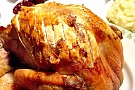 2. Kalkon: Gnid in kalkonen med salt och vitpeppar. Fyll den med brödblandningen. Lägg kalkonen på ett galler i en långpanna. Häll kycklingbuljongen i bottnen på långpannan. Smält smöret. Stek kalkonen i 175° ugn, ca 45 minuter per kilo. Börja med att steka ryggen, sedan sidorna och till sist ovansidan. Pensla med smält smör mellan varven. Ta ut och svep in kalkonen i folie.