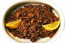 3. Blanda i köttet och räkorna och tillsätt sedan riset. Blanda om väl och låt allt fräsa någon minut så att riset blir varmt. Rör sedan ner äggblandningen och fortsätt röra tills ägget har stelnat i strimlor. Servera med citronklyftor.