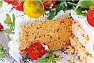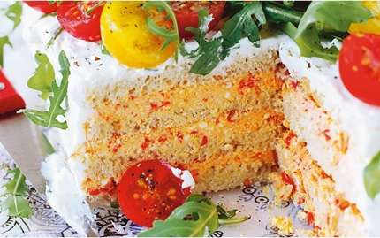 Bred kvarg över hela tårtan. Garnera med ruccola och körsbärstomater. Strö över salt och peppar.