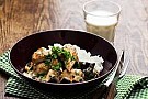 Skär kyckling och svamp i bitar och fräs dem i smör. Tillsätt grädde, buljong, senap och vitlök. Låt koka ca 5 min. Smaka av med timjan och svartpeppar. Strö över persilja.