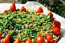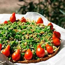 Skölj blomkålshuvudet och bryt försiktigt av små buketter (eller skär av dem med kniv). Mixa avokado, citron och örtsalt till en kräm. Vänd ner blomkålsbuketterna i avokadokrämen och blanda väl. Bred ut blomkålsguacamolen i pajskalet, sprinkla över oliv- och paprikapersilladen och dekorera med körsbärstomter. En underbar mäktig paj som jag serverar med grönsallad.
