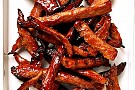 1. Skär köttet på längden i tunna strimlor. Blanda sprit, socker, soja och bönsås i en bunke. Vänd ner köttet. Marinera det i 45 minuter.