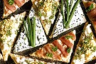 4. Ostsnitt: Blanda bredbar pepparrotsost med lite svart stenbitsrom och bred på brödet. Garnera med gräslök.