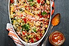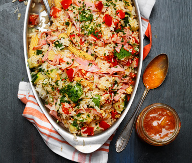 Koka riset enligt anvisningen på förpackningen. Skala och hacka löken fint samt skär zucchini och urkärnad paprika i små bitar. Låt minimajsen rinna av och dela den på längden. Hetta upp oljan i en stekpanna och stek äggen under omrörning, tillsätt riset och grönsakerna och stek vidare tills grönsakerna är mjuka. Strimla skinkan och tillsätt den. Strö över persilja och smaka av med salt och peppar. Servera med mango chutney. För alla Läs noga ingrediensförteckningen på mango chutney. I övrigt är rätten fri från gluten, laktos och mjölkprotein. Rätten innehåller ägg.