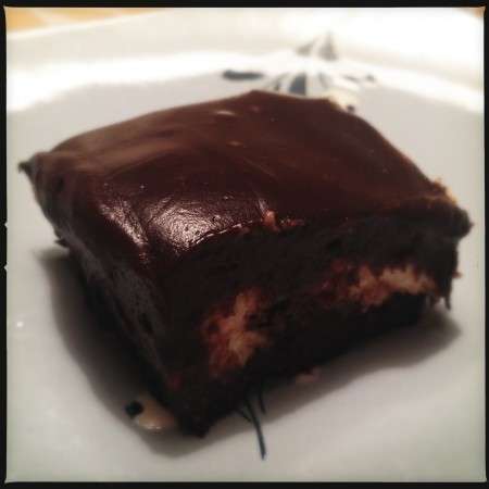 Blanda alla ingredienser i en blender eller matberedare tills en glansig och slät glasyr bildas. Brev över brownien och låt stelna i kyl.
