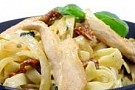 3. Smaksätt med basilika, salt och peppar. Sila av pastan och vänd ner osten och kycklingsåsen.