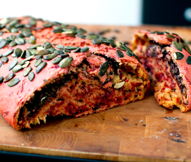 Sätt ugnen på 175°C. Pensla med vatten och strö över pumpakärnorna.