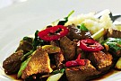 Ansa och skär salladslöken i skivor på snedden. Låt salladslöken fräsa med en stund. Tillsätt kanel, ingefära, chili, currypasta, vatten och soja.