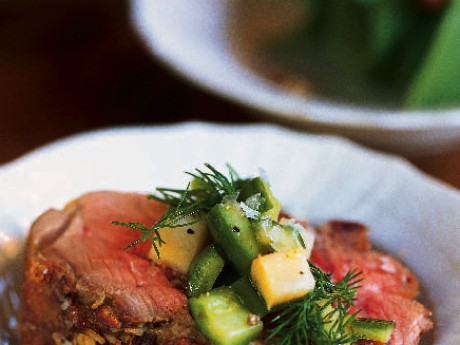 4. Skär steken i tjocka skivor och servera med tillbehören.