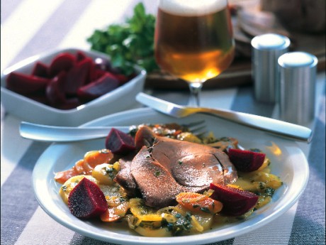 6. Ta ut köttet och låt det vila 15 min i folie. Skiva köttet tunt med vass kniv och servera det med sjömanspotatis och snabbinlagda rödbetor.