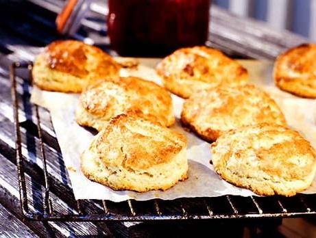 1. Värm ugnen till 225 grader. Skär smör i tunna skivor. Hacka samman mjöl, bakpulver, salt och smör. Tillsätt mjölken och arbeta snabbt ihop till en deg.