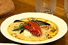 3. Koka upp blåmusslorna för sig, samt ha räkor och kräftstjärtar, eller andra skaldjur, beredda, tillsätt sedan skaldjur och musslor. Tillsätt skaldjuren omedelbart före serveringen. Servera i djup tallrik, lägg gärna musslorna direkt i den djupa tallriken, utan att de varit i den stora kastrullen. Dekorera med en klick crème fraiche, en dillkvist och en skalad krabb- eller hummerklo.