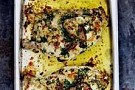 1. Dela kycklingen längs med bröstbenet så det blir två halvor. Lägg dem i en form.