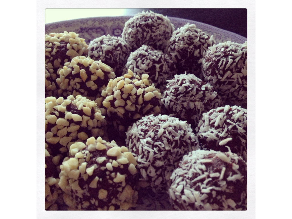 Blanda alla torra ingredienser och knåda ihop det med smöret. Rulla till lagom stora bollar och rulla några i hackad mandel och några i kokos. Ställ in i kylen :)