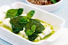 2. Repa bladen från basilikan. Skala vitlöksklyftan. Mixa basilika, vitlök, ost, 1 krm salt och olivolja. Fördela blandningen på fisken. Tillaga mitt i ugnen ca 15 min.