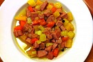 4. Tärna falukorven (använd gärna en med hög kötthalt, hittade en på ICA med 71 %) i ca samma storlek som potatisen och kalroten, in i grytan. Sänk värmen till trean.
