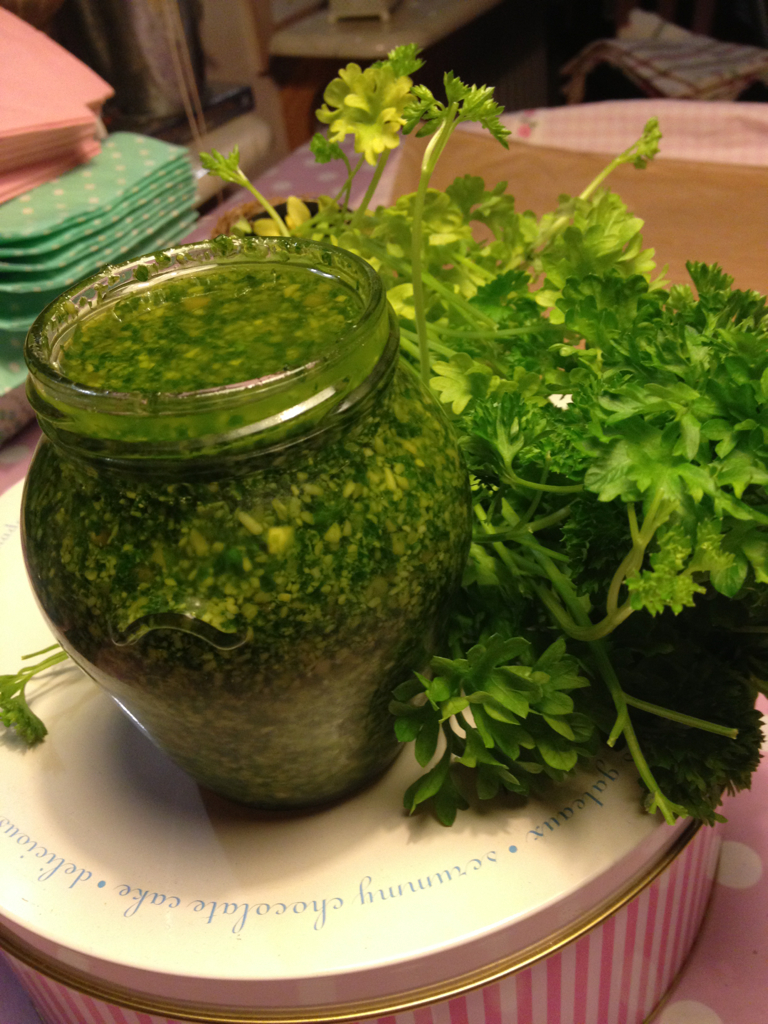 1 Finhacka vitlök och nötter. Det blir godast om du gör det för hand. Persiljan kan man köra i mixer. Riv osten.