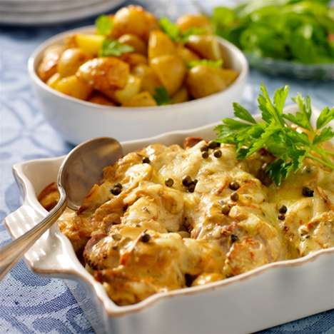 4. Skiva köttet och lägg i en ugnsfast form. Häll såsen över och strö på ost. Gratinera på 225° i ca 10 minuter. Servera med rostad potatis.