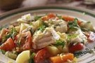 Skär fisken i bitar och tomaten i klyftor. Lägg ner det i grytan och koka ytterligare 3–4 min. Strö över strösslet.
