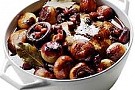 3. Tärna och knaperstek fläsket och låt det rinna av på hushållspapper. Stek champinjonerna i baconflottet. Skala steklökarna. Stek dem till gyllenbrun färg, tillsätt socker och ca 1 dl rödvin. Låt rödvinet koka in under lock. Tillsätt champinjoner och bacon.