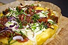 Fördela lök, soltorkade tomater, mozarella och salami på polentan. Baka i ugnen ca 6-8 min, tills osten blivit gyllenbrun.
