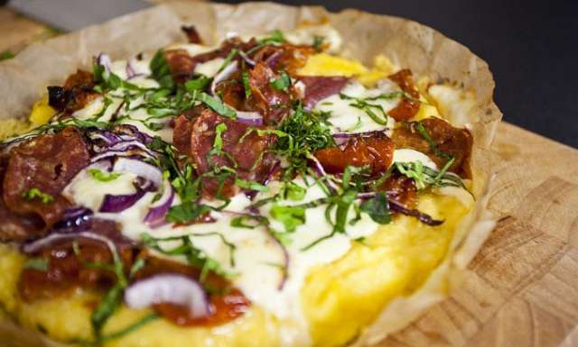 Lägg bakplåtspapper i botten på en ugnssäker form, häll i polenta och fördela jämnt ut i kanterna.