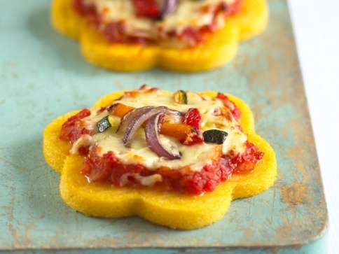 Skär ut 4 cirklar i polentan, eller någon annan fin form, ca 9 cm i diameter.