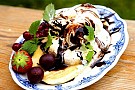 11. Montering Bygg upp en "bakelse" med banan och marängen i botten. Lägg på några kulor glass. Spritsa på grädden och garnera med färska bären. Häll sist över chokladsåsen och servera.