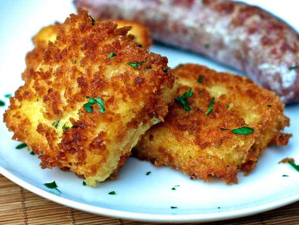 Vispa ägg och mjölk i en skål och lägg ströbrödet på ett fat. Doppa varje polenta-fyrkant i äggsmeten och vänd i ströbrödet.