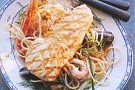Grillad senapsmarinerad hälleflundra med skaldjursspaghetti