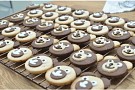 När kakorna har svalnat så blandar du till kristyr och smälter mörk choklad. Spritsa på ögonvitor på alla kakor och sen en pupil med mörk choklad på alla. Sedan gör du munnen och nosen i kristyr på dom med mörk nos och spritsar mun och nos med choklad på dom med ljusa nosar