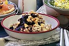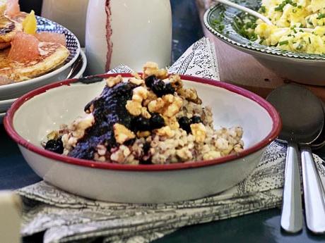 1. Spola bovetet först med hett vatten och sedan med kallt vatten. Lägg det i en kastrull och tillsätt vatten och salt. Småkoka tills bovetet är mjukt, ca 20 min. 2. Skala och skär bananen i bitar. Blanda ner bitarna i gröten när 2–3 min återstår av koktiden. Rör ner linfröna. 3. Sirap: Tina blåbären. Spara ca 2 msk blåbär till garnering. Mixa resten av blåbären och agavesirap med mixerstav. Ringla sirapen över gröten. Servera med valnötter och havremjölk.