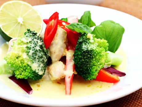 3. Tillsätt kokosmjölken, finhackad broccoli, tunt skuren paprika och hackad lök. Koka tills grönsakerna börjar bli mjuka (ca 10 minuter) och tillsätt sedan kryddorna. Koka ytterligare några minuter. Servera.