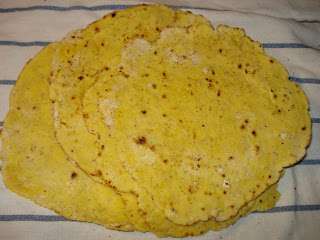 Ta upp och knåda degen på mjölat bakbord. Dela degen i 10 bitar och kavla/tryck ut varje del till en rund, tunn tortillaform. (täck med en handduk så att de inte torkar!)