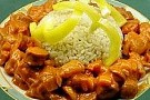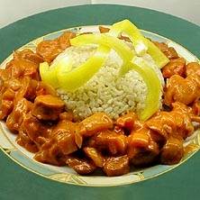 2. Strimla korven och hacka löken och paprikan. Spara en bit paprika till garnering. Bryn matfettet och fräs korv och lök några minuter. Strö över mjölet och rör runt.