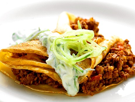 3. Hacka löken fint. Bryn köttfärsen och löken, krydda med tacomix och tillsätt de passerade tomaterna. Låt puttra i 10 minuter. Fyll varje pannkaka med 1 dl av fyllningen och rulla ihop dem. Lägg rullarna i en gratängform, strö över riven ost och gratinera i ca 10 minuter tills osten smält och blivit gyllenbrun.