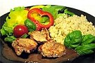 6. Servera fläskfilé med sås och risotto samt en blandad sallad.