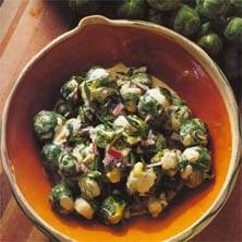 Snoppa och koka brysselkålen i lättsaltat vatten ca 10 minuter eller tills de känns klara med provsticka. Akta så att de inte blir överkokta. Lite fasta är bara gott om de är. Sila av brysselkålen i durkslag. Fräs löken mjuk i smöret (detta kan göras medan brysselkålen kokar), slå på grädden som långsamt får koka ihop i ca 10 minuter. Tillsätt senap och eventuellt salt och peppar. Vänd ner brysselkålen.
