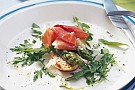 2. Rosta brödskivorna och lägg dem på tallrikar. Arrangera parmaskinka och rucolasallad på och runtom brödet.