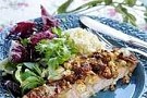 3. Lägg laxen i en ugnsform med toppingen ovanpå. Gratinera 20 minuter. Servera med bulgur och sallad.