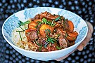 Hetta upp en stor gryta eller kastrull med smör och bryn köttet tillsammans med korianderfrö, kardemumma och harissa. Tillsätt lök och vitlök och fräs tills det är mjukt. Tillsätt salt, torkad frukt, buljong och tomatpuré.