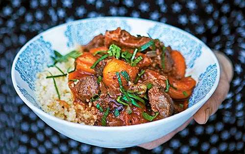Koka upp, skumma av och låt sjuda under lock i cirka 1 ½ timme eller tills köttet är mört. Tillsätt under tiden mer vätska om det behövs. Krydda med rikligt med svartpeppar och toppa med hackad persilja. Servera gärna tillsammans med couscous.
