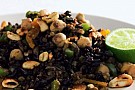 4. Blanda ihop alla ingredienser när riset är färdigkokt men strö sist över nötterna. Servera med lime att pressa över.