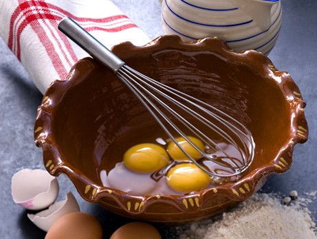 3. Häll i resten av mjölken och knäck i äggen. Vispa pannkakssmeten slät med smält matfett och låt den stå och svälla en stund.
