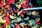 2. Skölj och kärna ur paprikorna och skär i stora bitar. Skölj tomater, zucchini och aubergine och skär allt i stora bitar.