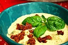Mixa tomater, basilika och vitlök. Tillsätt parmesanost, créme fraiche och majonnäs. Smaka av med svartpeppar.