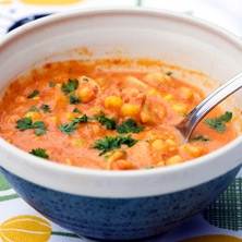 2. Låt koka 15 minuter. Tillsätt sedan majsen och låt koka några minuter till. Garnera med basilika.