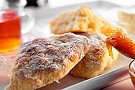 1. Värm ugnen till 225°. Skär smöret i tunna skivor. Hacka samman mjöl, bakpulver, salt och smör. Tillsätt mjölken och arbeta snabbt ihop till en deg.