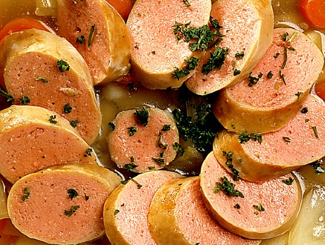 3. Ta upp den färdigkokta korven. Skär den i bitar eller skivor och lägg tillbaka den i grytan. Strö över persiljan. Servera på klassiskt manér med hårt bröd med ost.